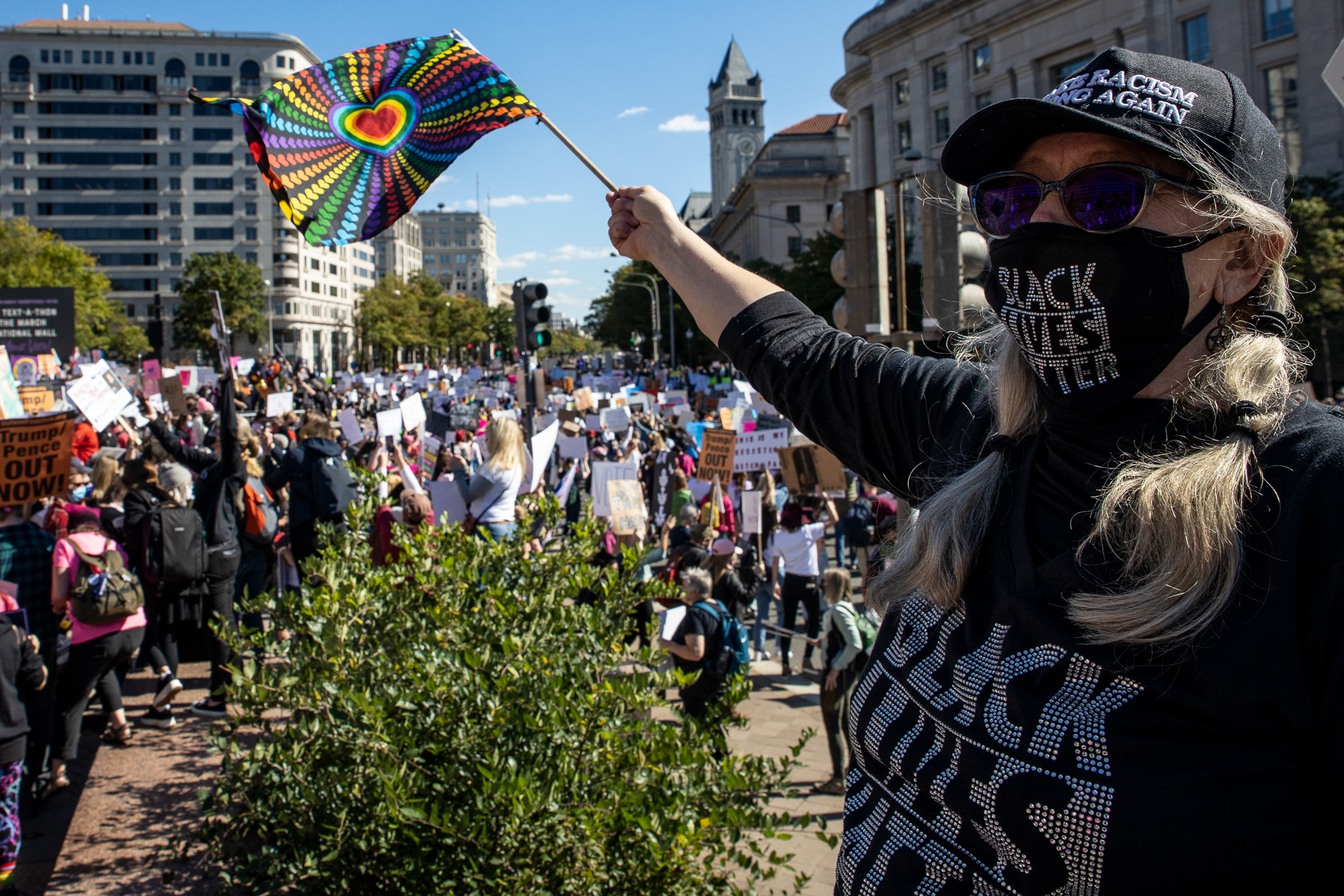 Members of the popular television show Real Housewives of Orange County, Braunwyn Windham-Burke (Left) and Noella Bergener (Right), support women at the Women's March in Washington D. C. The Women's March, a feminist organization, planned a rally and march to bring opposition against President Donald Trump’s plans to fill the Supreme Court seat left by Ruth Bader Ginsburg death with conservative nominee Amy Coney Barrett in Washington, D. C. on Oct. 17, 2020.