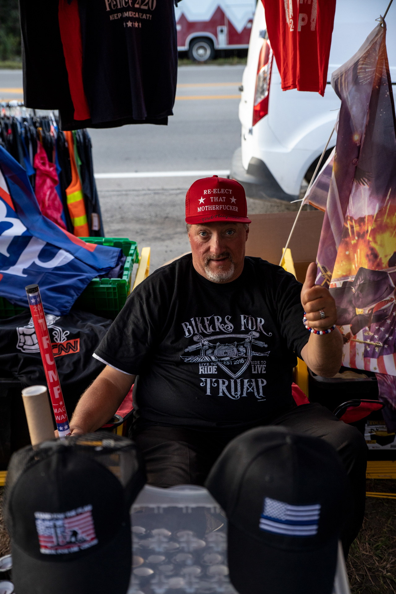 Trump Parade participant waves a flag out of the window on I-270 while holding onto his hat in Columbus, Ohio on Oct. 3, 2020. Trump supporters showed up in large numbers on I-270 to form a parade line on the highway encircling Columbus, Ohio, from 10am to noon to show support for President Donald Trump during election season.